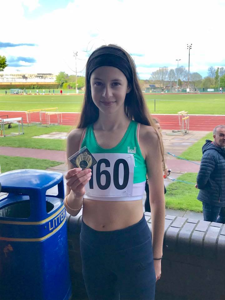 At the Northwood Stadium in Stoke-on-Trent, Arantxa Middleton continued her fine form to take the Staffordshire Under-15 Girls 100 metres title; winning her heat and then the final with a new personal best of 13.2secs. Arantxa then went on to claim a second gold in the 300 metres with 44.1secs, followed by Lottie McLaren in 3rd place with 46.3secs.